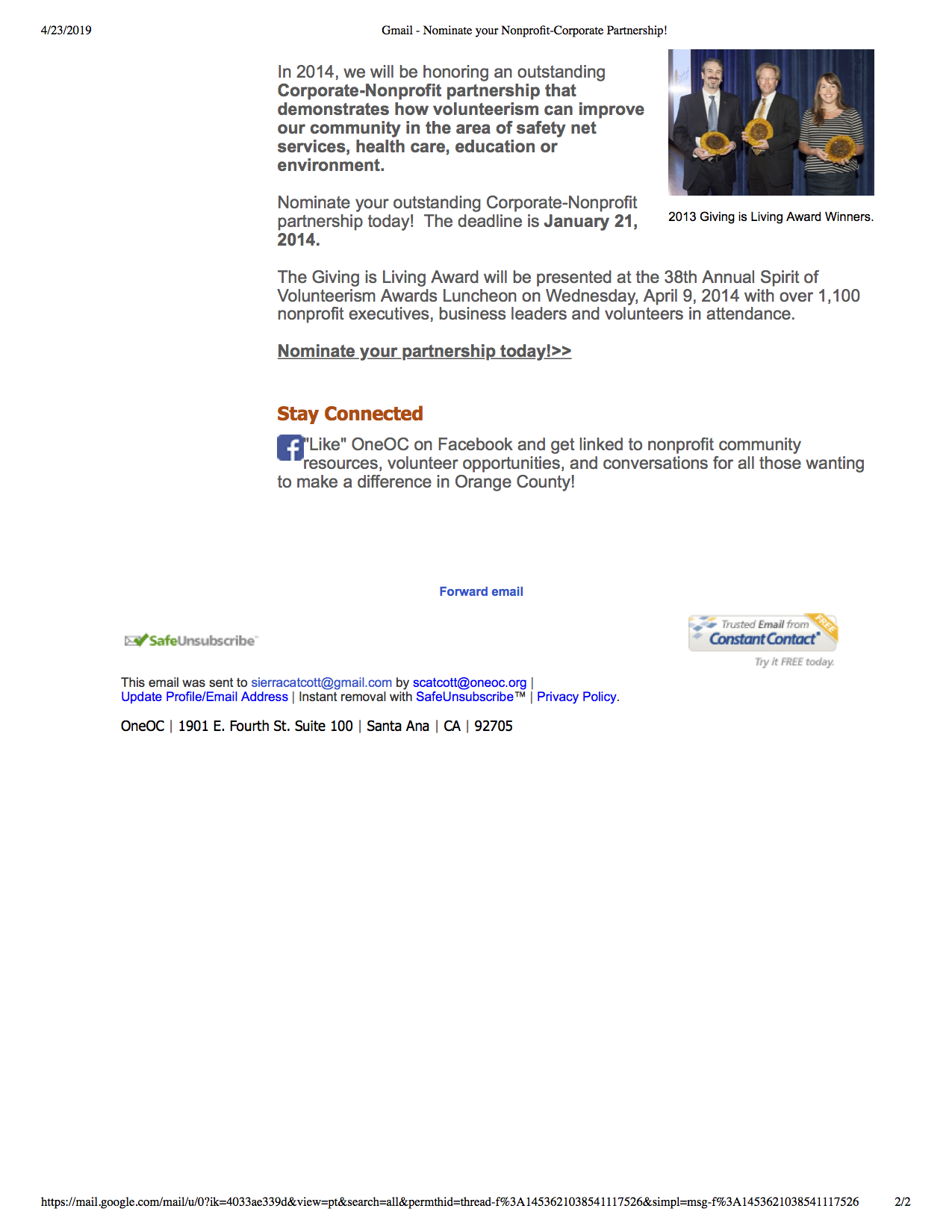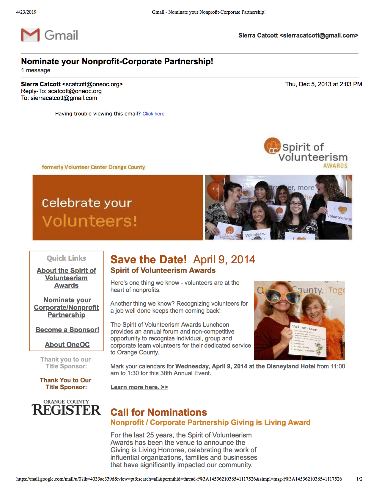 Wrote Copy and Designed Event Outreach for Constant Contact Email – OneOC’s 2014 Spirit of Volunteerism Awards.